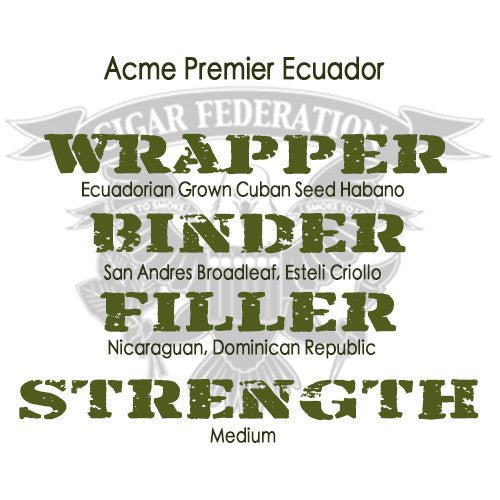 ACME Cigar Co. Premier Ecuador is one of three initial releases from ACME Cigars. It is a multi-national blend, with a four country mix of tobaccos. An Ecuadorian Habano wrapper covers Mexican & Nicaraguan binders and Nicaraguan & Dominican fillers.