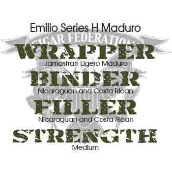 The Emilio Series H Maduro is blended in Danli, Honduras. The Serie H Maduro is a full-bodied smoke thanks in due part to double Ligero.  A dark Jamastran Ligero maduro wrapper sits atop a unique blend of Nicaraguan and Costa Rican tobaccos.  The resulting blend is a wonderful combination of strength and complexity with a rich flavor profile including hints of cocoa.