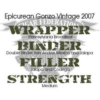 The Epicurean Gonzo Vintage 2007 provides a wonderfully complex medium bodied bouquet of broadleaf love to your palate. A double binder is applied under the fine Pennsylvania Broadleaf of San Andreas and Jalapa, with Jalapa and Condega fillers to produce depth and complexity beyond your normal blend.