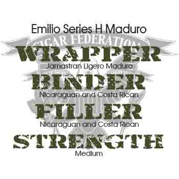 The Emilio Series H Maduro is blended in Danli, Honduras. The Serie H Maduro is a full-bodied smoke thanks in due part to double Ligero. A dark Jamastran Ligero maduro wrapper sits atop a unique blend of Nicaraguan and Costa Rican tobaccos. The resulting blend is a wonderful combination of strength and complexity with a rich flavor profile including hints of cocoa.