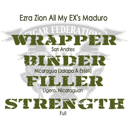 The Ezra Zion All My EX's Maduro uses a vintage San Andres maduro wrapper, around Nicaraguan binder and fillers. This combination of Ligero and the SA maduro wrapper creates a luscious full-bodied, full-strength cigar that will blow your ever-lovin' mind!